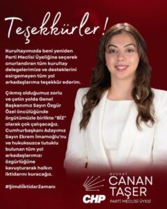 BURSA’NIN İLK PM ÜYESİ OLARAK GENÇ KIZIMIZ CANAN TAŞER’İ VE ÖRGÜTTEN GELDİĞİ İÇİN AV. YASEMİN RENÇBERİ YDK SEÇİLMESİNİ KUTLUYORUM.