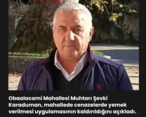 Muhtar Karaduman, “Obaalacami Mahallesi olarak almış olduğumuz kararı kamuoyu ile paylaşmak istiyorum. Dün akşamki toplantıda cenazelerde yemek verme konusunu uygun bulmadığımı, cenazelerde yemek verme uygulamasının kaldırılması gerektiğini halkımıza sundum. Toplantıya katılan tüm halkımız oy birliği ile kaldırılmasını uygun görmüştür. Yani Obaalacami Mahallesi’nde cenazelerde yemek vermek kaldırılmıştır. Toplantıya katılan tüm halkımıza sonsuz teşekkürler ediyorum. Almış olduğumuz bu karar inş’ALLAH hayırlara vesile olur” dedi.