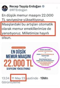 11 Mayıs 2023 tarihli paylaşımda, “En düşük memur maaşını 22.000 TL seviyesine yükseltiyoruz. Maaşlardaki bu artışları otomatik olarak memur emeklilerimize de yansıtıyoruz” ifadeleri kullanılmıştı.
